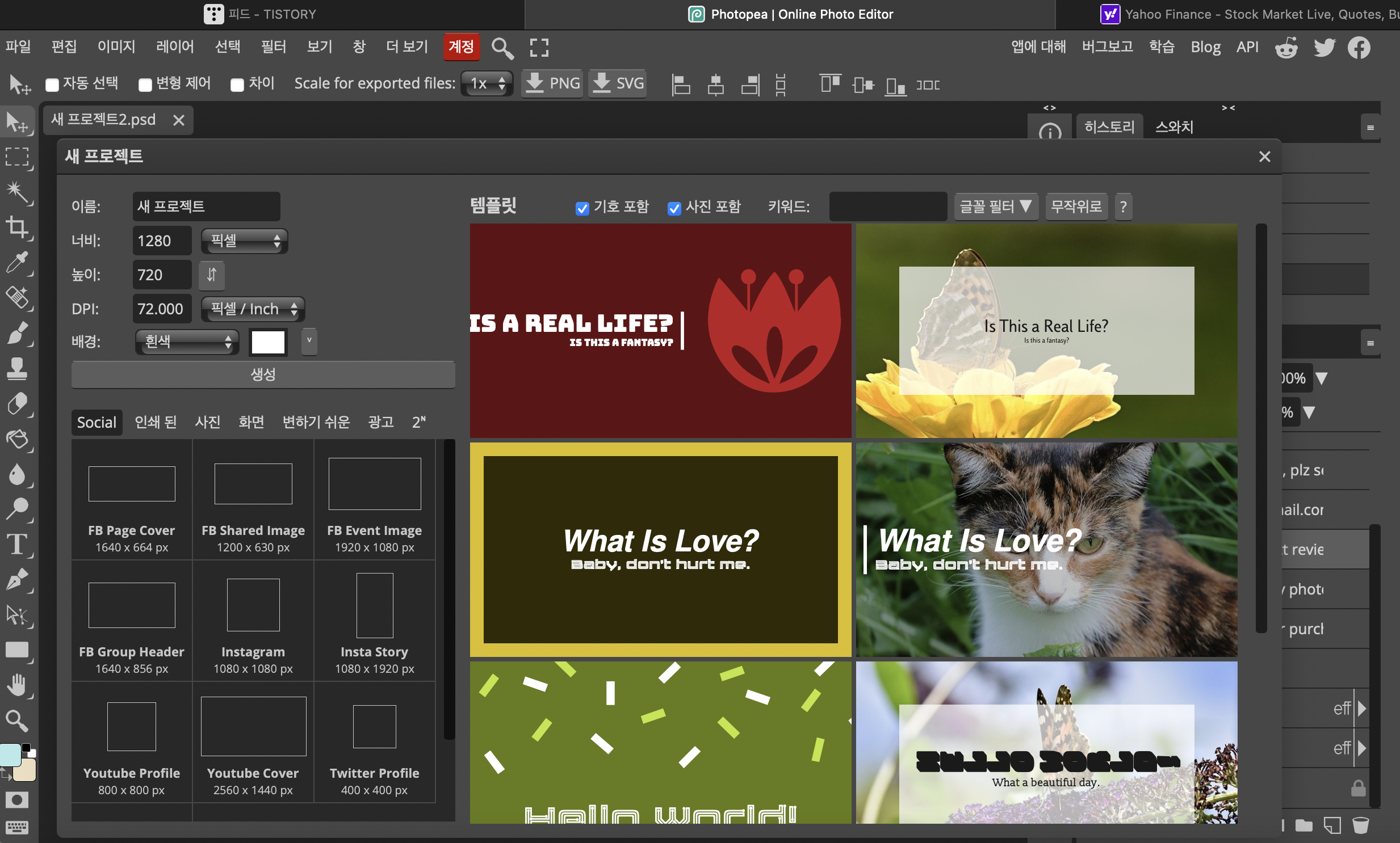 각종 SNS용 커버나 프로필 이미지 편집을 위한 템플릿 설정 화면으로 시작을 합니다. 만들고자 하는 이미지 크기가 정해져 있으면 너비와 높이를 지정해서 새 프로젝트를 생성하면 되겠습니다.