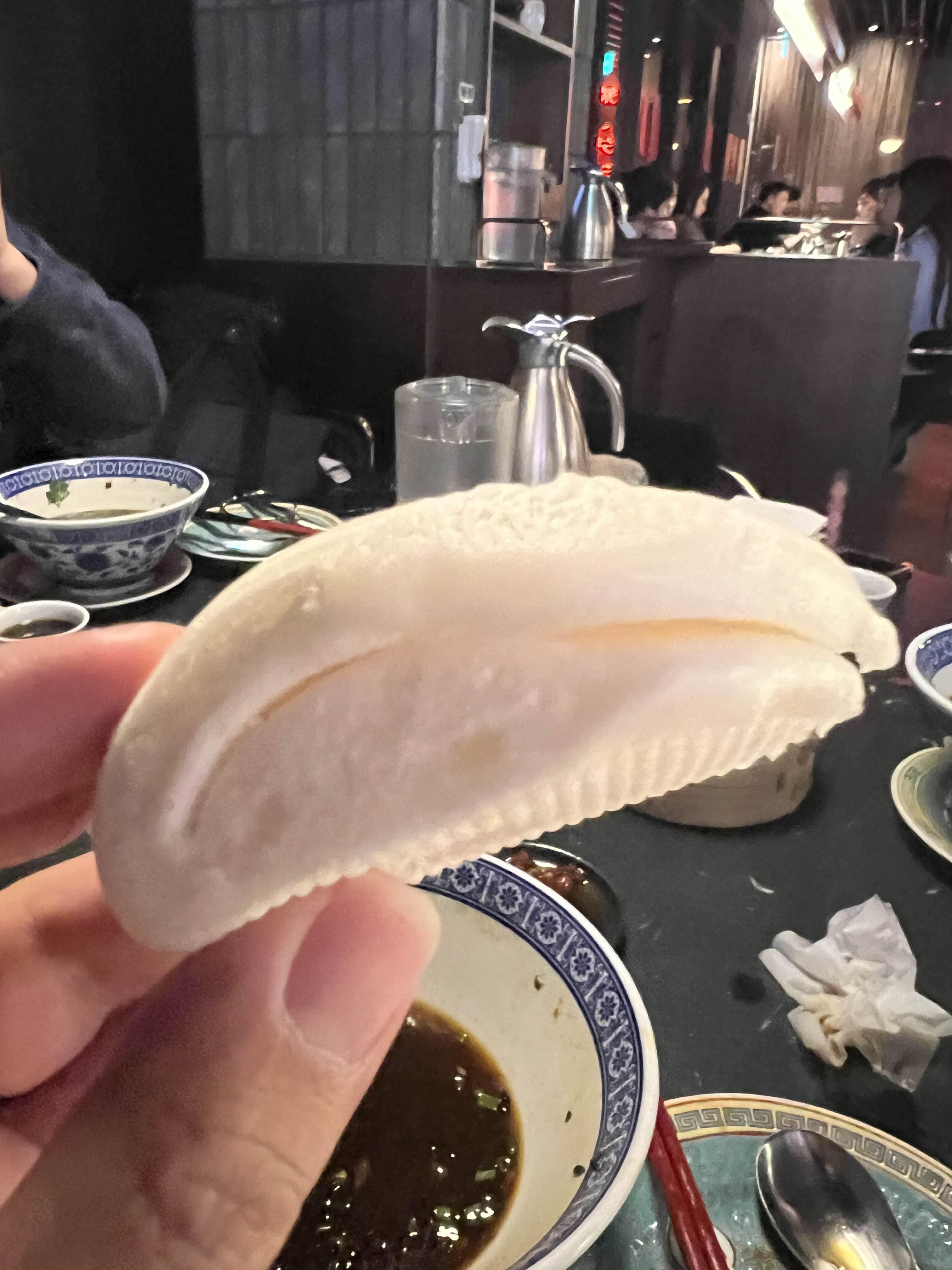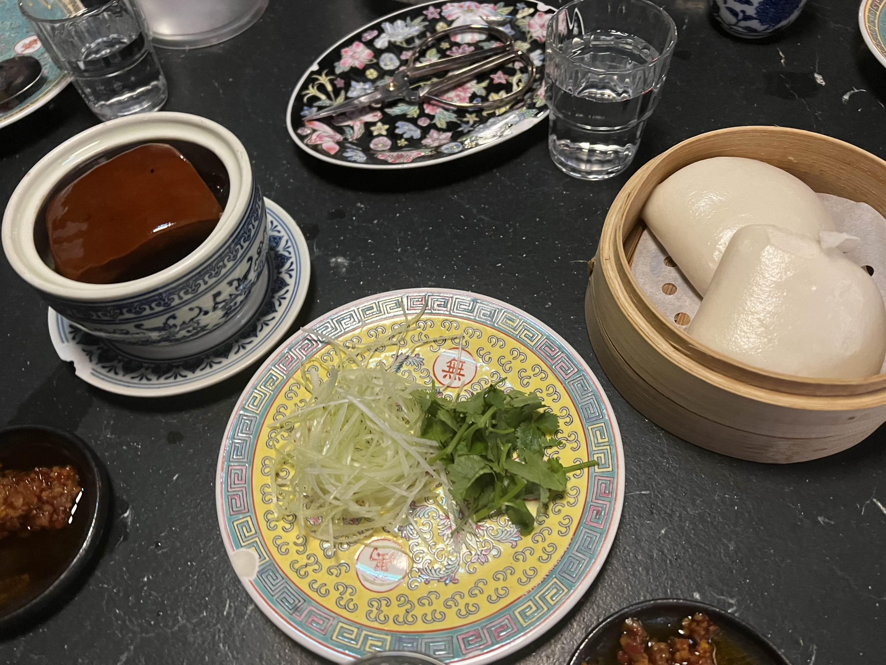 동파육도 나왔습니다. 여기는 꽃빵과 함께 나오네요. 왼쪽 위에 흡사 선지처럼 보이는데, 엄청 부드럽습니다. 가위도 따로 줘서 잘라서 노나먹습니다.