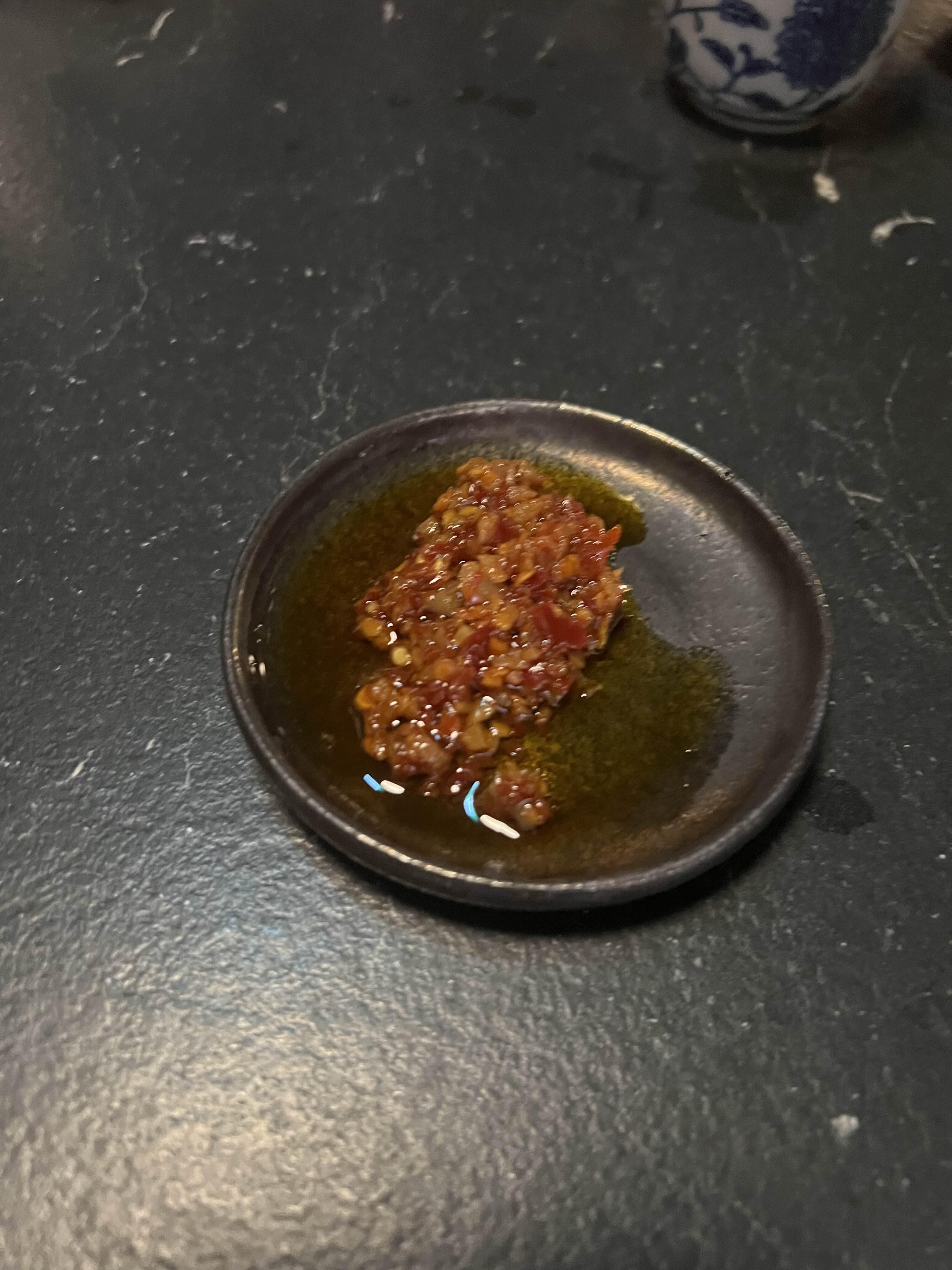 정확히 정체는 모르겠으나 마늘다짐과 고추기름 아닐까 싶습니다. 우육면을 매콤하게 먹고 싶으면 추가해 먹으라고 안내해 줍니다.